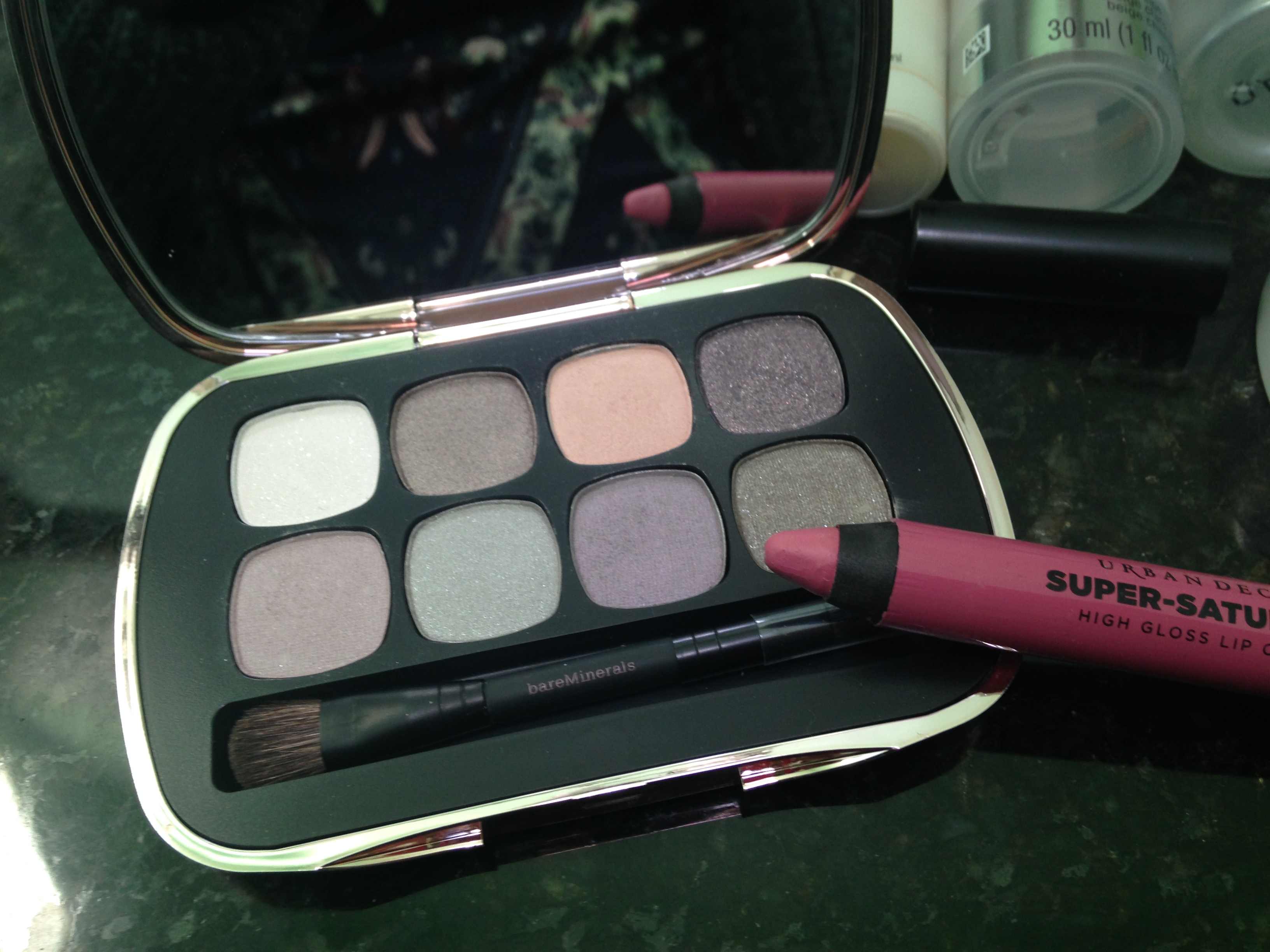 Face: Smashbox More than Primer Blemish Control, Benefit Erase Paste, Smashbox High Definition Concealer, bareMinerals Well Rested, Neutrogena Mineral Powder, bareMinerals Mineral Powder, L’oreal Magic Lumi Primer (highlight), Milani Baked Bronzer, Almay Smart Shade Blush (Pink), bareMinerals Luminizer, MAC Fix+